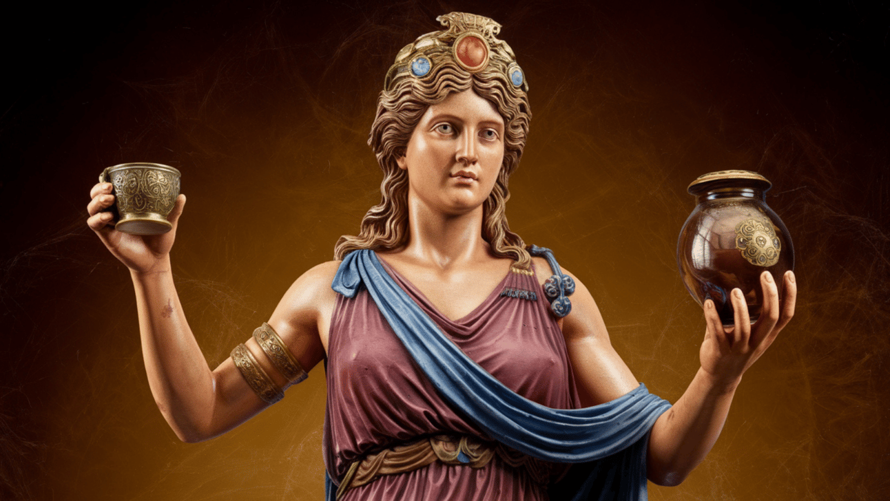 A deusa grega antiga Temperantia (Temperança), segurando uma taça em uma mão e uma jarra na outra, representando a virtude da moderação e equilíbrio.